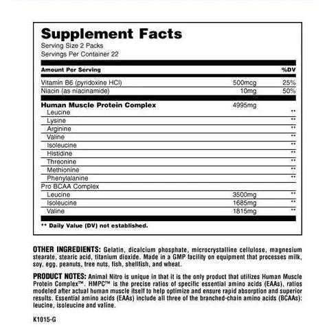 Animal Nitro is made up of what is known as Essential Amino Acids (EAA's). EAA's get that name as our body cannot produce these nutrients by itself and it is "essential" we derive them from our diet.