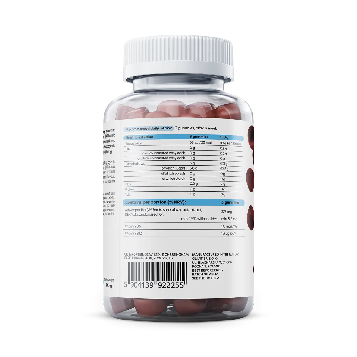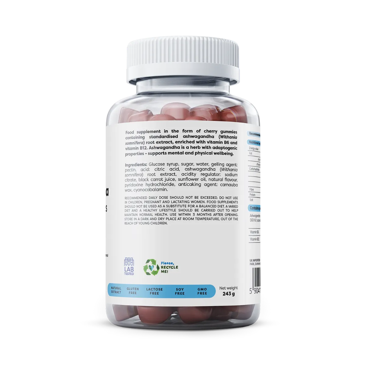 Glucose syrup, sugar, water, ashwagandha (Withania somnifera) root extract, gelling agent: pectin, acid: citric acid, acidity regulator: sodium citrate, natural food colour: anthocyanins, coconut oil, natural flavour, pyridoxine hydrochloride, glazing agent: carnauba wax, cyanocobalamin.