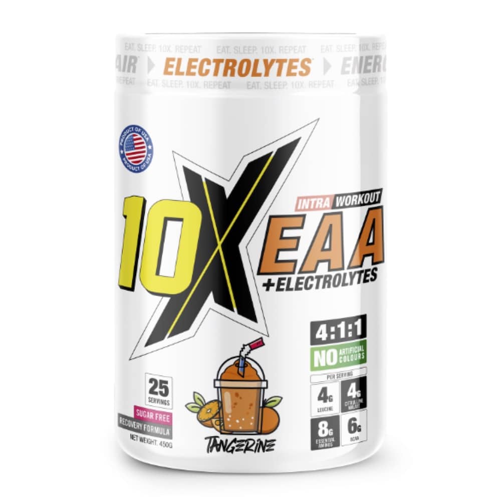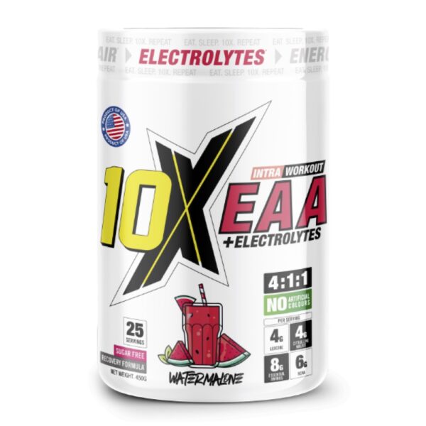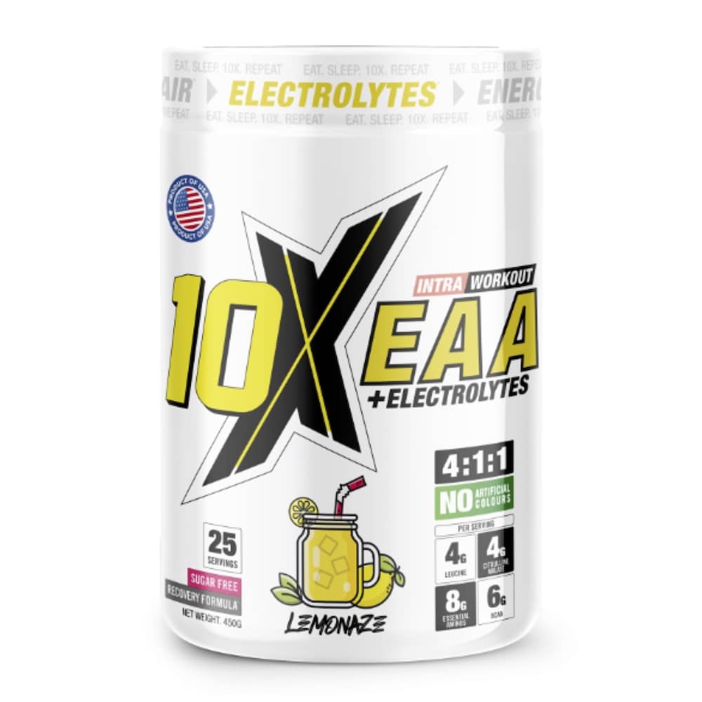 10X EAA’s with electrolytes - Packing 9 essential amino acids, B vitamins, 750mg electrolytes and 4000mg of Citrulline Malate & Leucine per serving 10X EAA’s is the perfect intra-workout drink to help you stay hydrated, get pumped and recover from those intense workouts. Perfect to stack with 10X STIM or 10X PUMP.