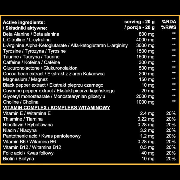 Behemot suplement przedtreningowy wyróżnia się sprawdzonym i starannie dobranym składem. Zawiera składniki takie jak: