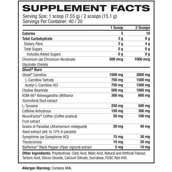 Caffeine junkies rejoice...GHOST® Burn is loaded with 300MG of Caffeine per 2-scoop serving (150MG per scoop).
