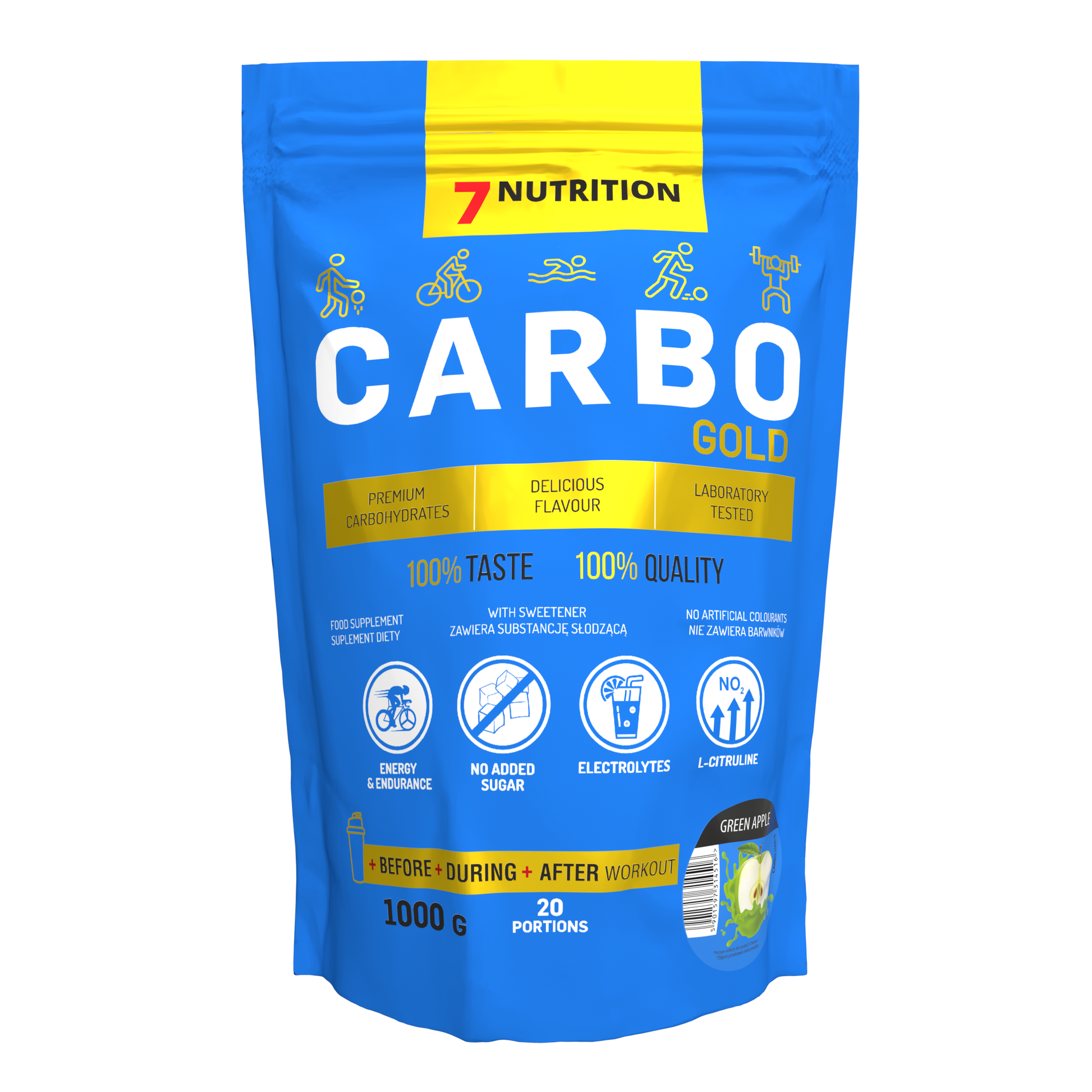 7Nutrition CARBO GOLD 1000g . Suplement diety. Zawiera substancję słodzącą. Kompozycja oparta na węglowodanach wzbogacona o jabłczan cytruliny i kompleks minerałów ważnych podczas intensywnego wysiłku fizycznego. Kompleks węglowodanów przyczynia się do przywrócenia prawidłowej funkcji mięśni podczas długotrwałego treningu i uzupełnienia strat glikogenu w mięśniach. Formułę dodatkowo uzupełnia kompleks minerałów. Magnez, który pomaga zmniejszyć uczucie zmęczenia i znużenia, a także potas i sód, których prawidłowa równowaga wspomaga regenerację mięśni i odpowiada za gospodarkę wodno-elektrolitową organizmu. Zawartość wapnia przyczynia się również do utrzymania prawidłowego metabolizmu energetycznego. Produkt przeznaczony jest dla osób dorosłych uprawiających sporty rekreacyjnie oraz dla sportowców wykonujących długotrwałe i intensywne ćwiczenia fizyczne.