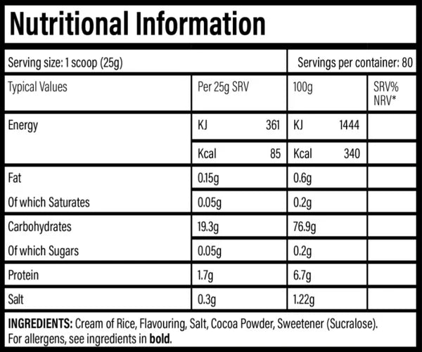 PEANUT BUTTER CUP, COOKIES & CREAM FLAVOUR INGREDIENTS: Rice Flour, Flavouring, Cocoa Powder, Salt, Sweetener (Sucralose).
