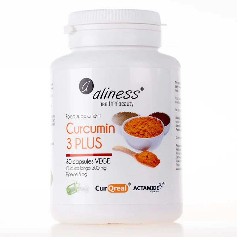 Aliness Curcumin 3 PLUS is a composition of 100% natural curcuminoids, in the form of the patented CurQreal® turmeric extract. The product consists of three chemical compounds naturally occurring in turmeric: curcumin, desmethoxycurcumin (DMC) and bis-desmethoxycurcumin (BDMC). To increase the bioavailability of curcuminoids, the blend was enriched with natural ACTAMIDE ® pepper extract, which contains 95% piperine and is obtained exclusively from by water extraction.