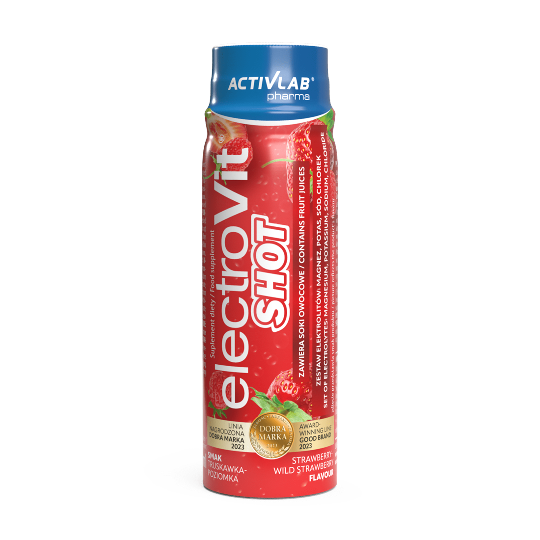 Non-carbonated beverage – shot with electrolytes, strawberry and strawberry-flavoured, containing: magnesium, potassium, sodium, chloride and glucose.