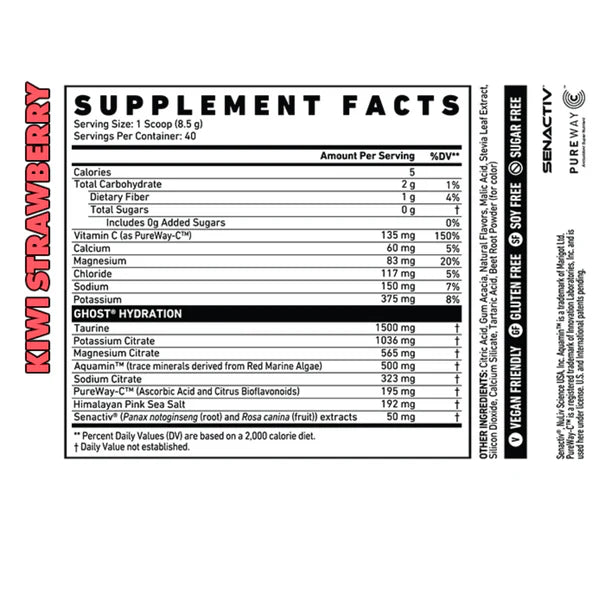 GHOST® HYDRATION was formulated to take your water to new heights––PACKED with a mighty dose of Taurine, an awesome base of Electrolytes, Potassium, Magnesium and Sodium Citrate, Himalayan Pink Sea Salt and Aquamin™ for added hydration and a couple of our favs, PureWay-C™ (the GOAT Vitamin C) and Senactiv®.