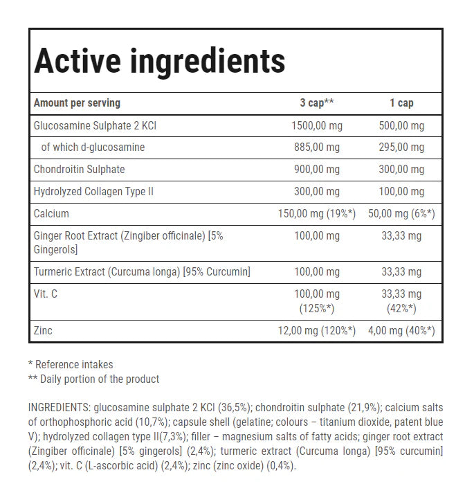 JOINT THERAPY PLUS contains glucosamine, chondroitin, hydrolyset collagen, concentrated plant extracts and minerals. Zinc and calcium contributes to the maintenance of normal bones and helps in the proper formation of connective tissue. JOINT THERAPY PLUS is enriched in vit. C wchich contributes to normal collagen biosynthesis for the proper function of joint cartilage. JOINT THERAPY PLUS is recommended for persons exposed to increased joint strain, especially for athletes.