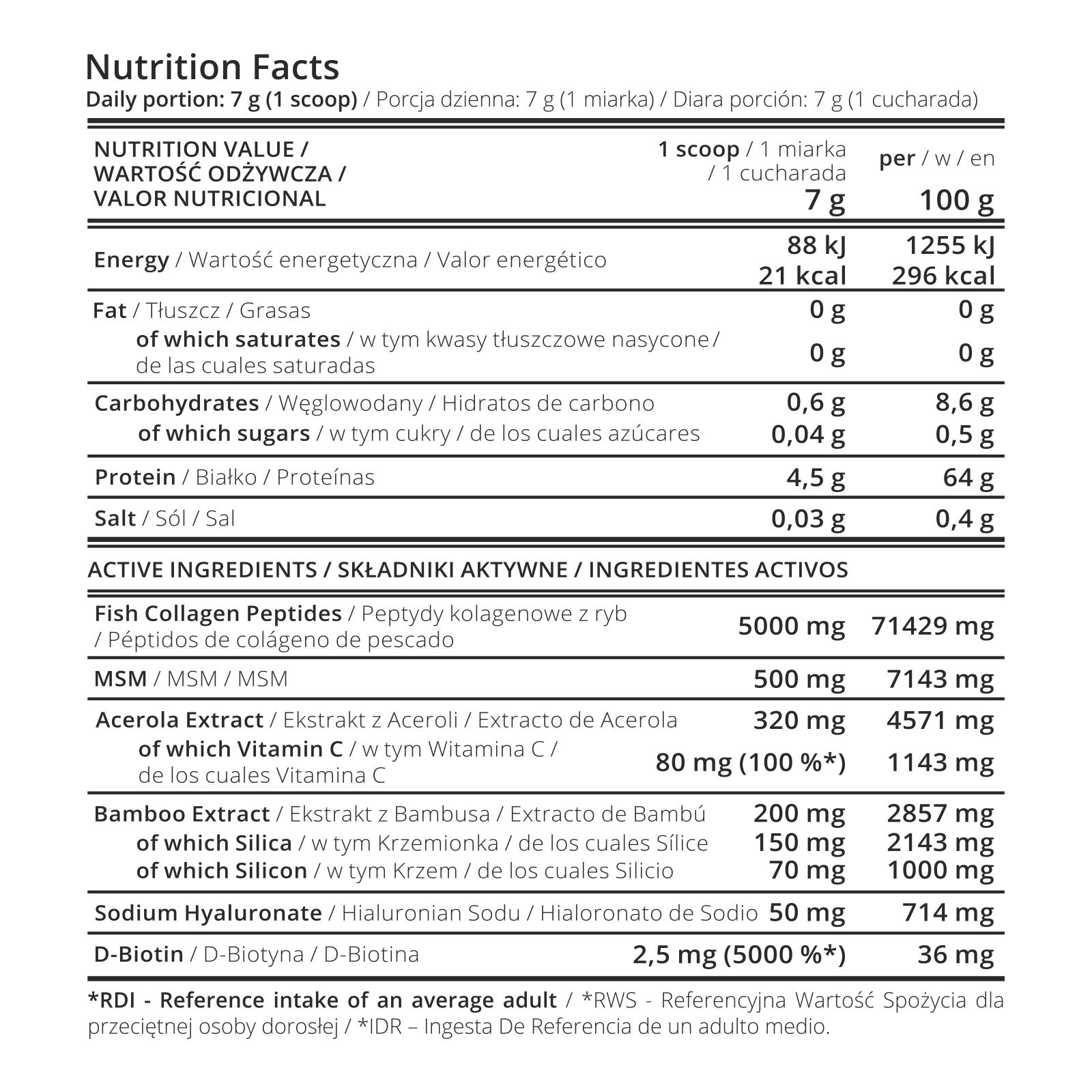 INGREDIENTS : Hydrolyzed fish collagen ; methylsulfonylmethane (MSM); acerola extract [fruit] (Malpighia glabra) [25% vitamin C]; bamboo extract [shoots] (Bambusa vulgaris) [75% silica]; red beetroot juice powder; hyaluronic acid (sodium hyaluronate) ; D-biotin; natural flavors; acidity regulator: citric acid. The product may contain: fish .