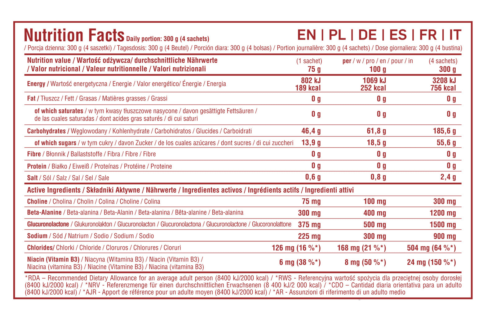 Per 100 g | 4 sachets (300 g) |