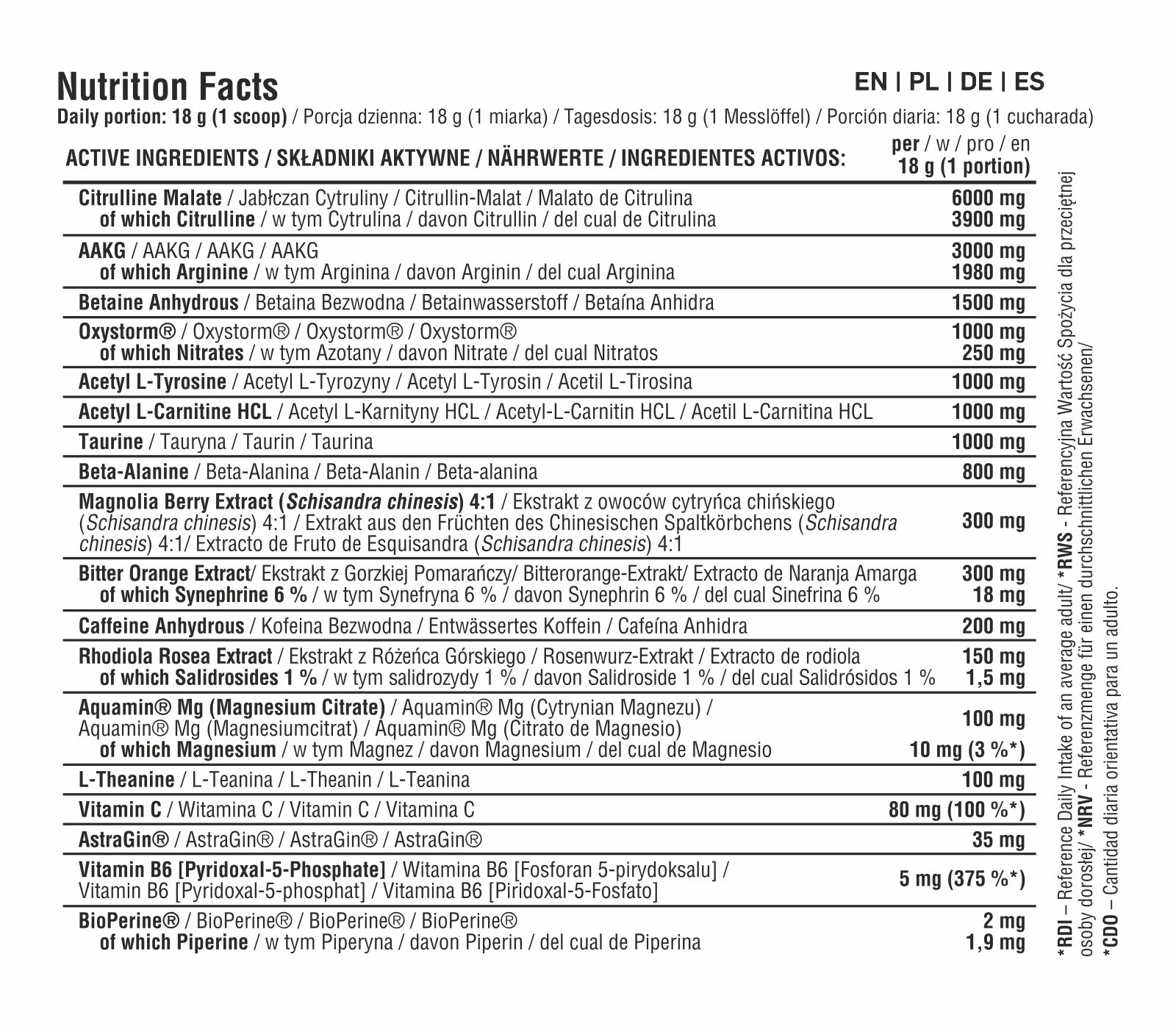 INGREDIENTS: Citrulline malate; AAKG (L-arginine alpha-ketoglutarate); betaine anhydrous; Aromas; Oxystorm (amaranth extract); Acetyl L-Tyrosine; Acetyl L-Carnitine HCL; taurine; beta-alanine; Schisandra chinesis fruit extract 4:1; bitter orange extract (6% synephrine); caffeine anhydrous; Rhodiola rosea extract (1% salidrosides); anti-caking agent: silicon dioxide; Aquamin® Mg (Magnesium Citrate); L-Theanine; acidity regulator: citric acid; vitamin C; sweetener: sucralose; Astragin; Vitamin B6 (5-pyridoxal phosphate); BioPerine black pepper extract (95% piperine).