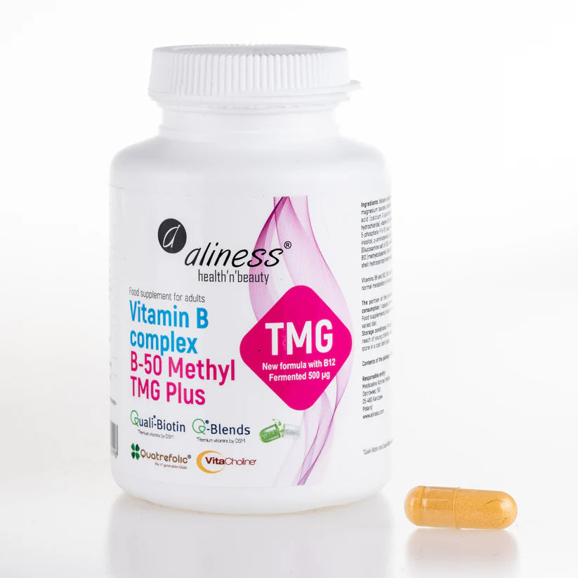 Składniki: Betaina bezwodna (Trimetyloglicyna TMG), Taurynian magnezu, Cholina (Vitacholine®), Kwas pantotenowy (D-pantotenian wapnia), Tiamina (chlorowodorek tiaminy), Witamina B2 (ryboflawina), Witamina B6 (pirydoksal 5-fosforan P-5-P), Niacyna (kwas nikotynowy, amid kwasu nikotynowego), Inozytol, Kwas p-aminobenzoesowy (PABA), Kwas foliowy Quatrefolic® (sól glukozaminowa kwasu (6S)-5-metylotetrahydrofoliowego), Witamina B12 (metylokobalamina), Biotyna (D-biotyna) (QualiBiotin®), otoczka kapsułki: (substancja wiążąca: Hydroksypropylometyloceluloza).