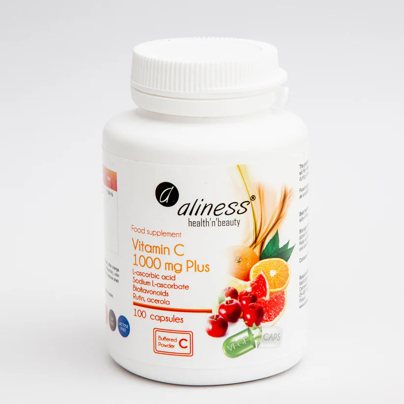 Aliness Vitamin C Plus is a food supplement containing vitamin C in the form of a mixture of L-ascorbic acid and L-ascorbate sodium in a 1:1 ratio, enriched with citrus bioflavonoids, hesperidin, rutin, and acerola obtained from a bitter orange extract (Citrus aurantium). Bioflavonoids support the action and bioavailability of vitamin C.