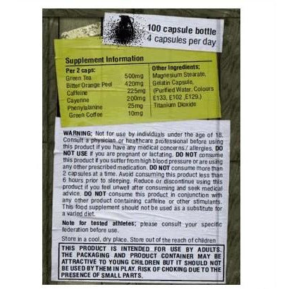 Green Tea, Bitter Orange Powder, Caffeine, Cayenne, Phenylalanine, Green Coffee, Bulking Agent (Magnesium Stearate), Gelatin Capsule (Purified Water, Colours E133, E102, E129), Titanium Dioxide